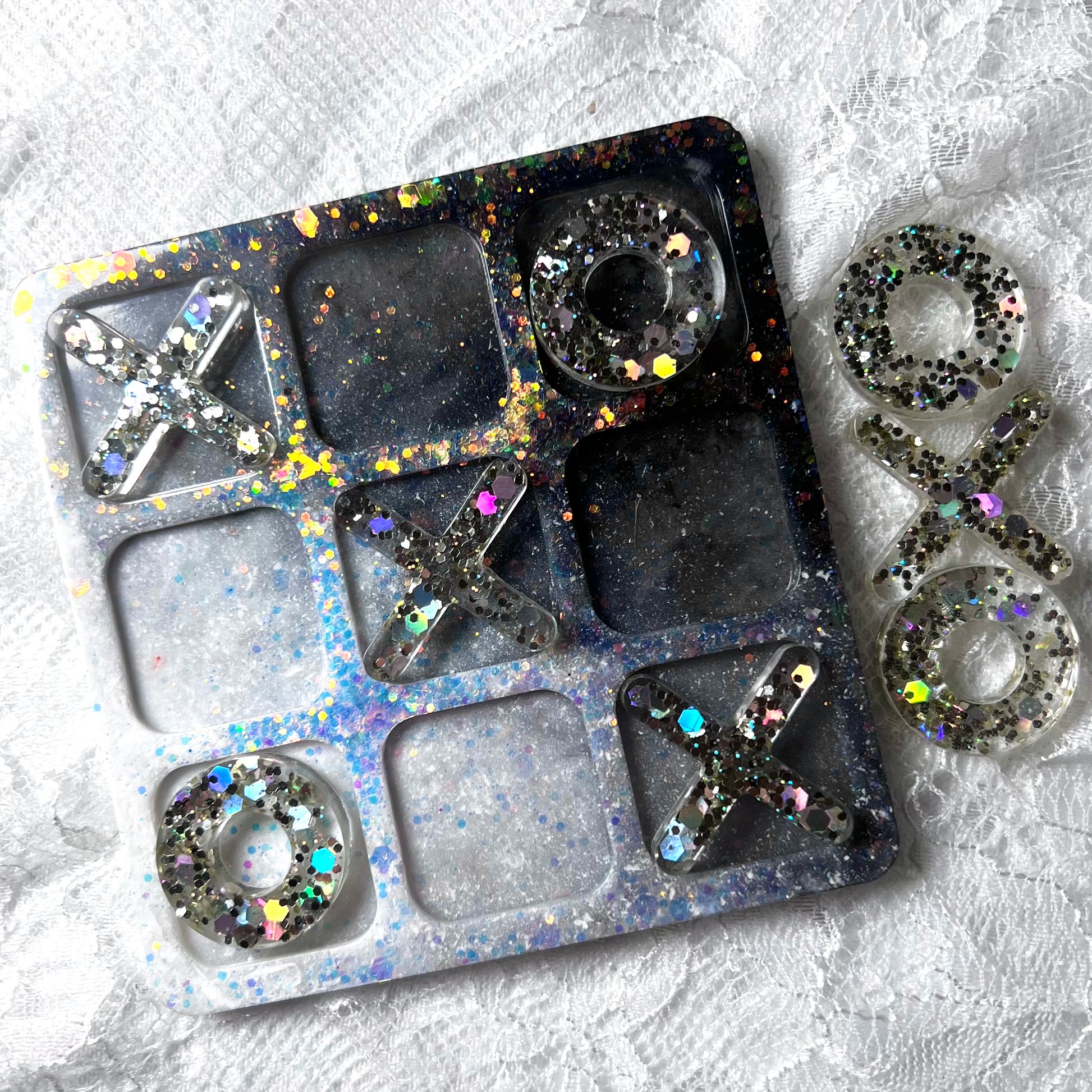 Silver holographic glitter Xs and Os. Board white to black ombre with holographic glitter.