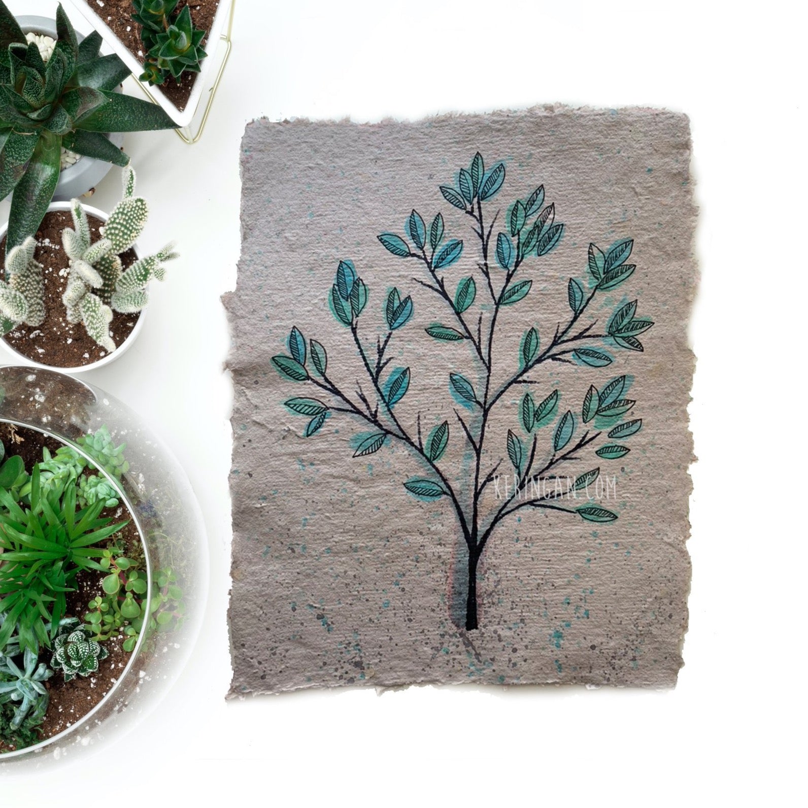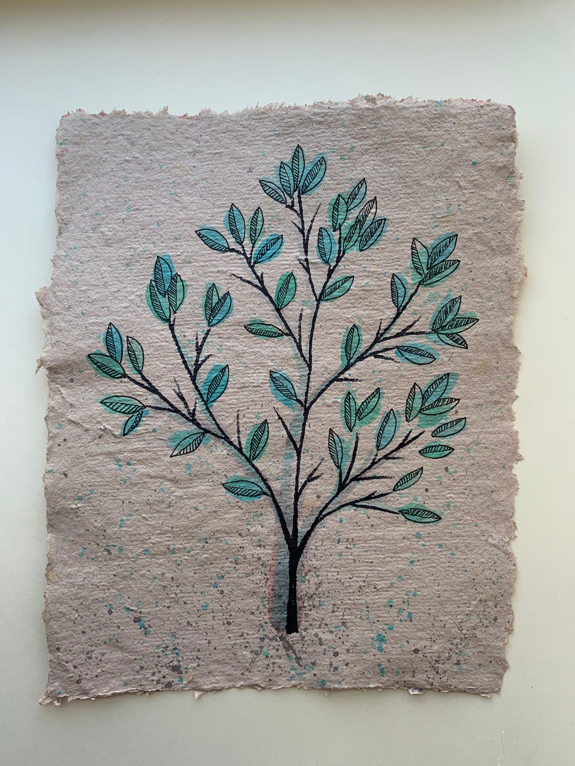 An abstract branch created on handmade paper with unfinished edges. Green watercolor leaves, splatter background, and inked stems. Colors and textures give this painting a very earthy and grounding feel.