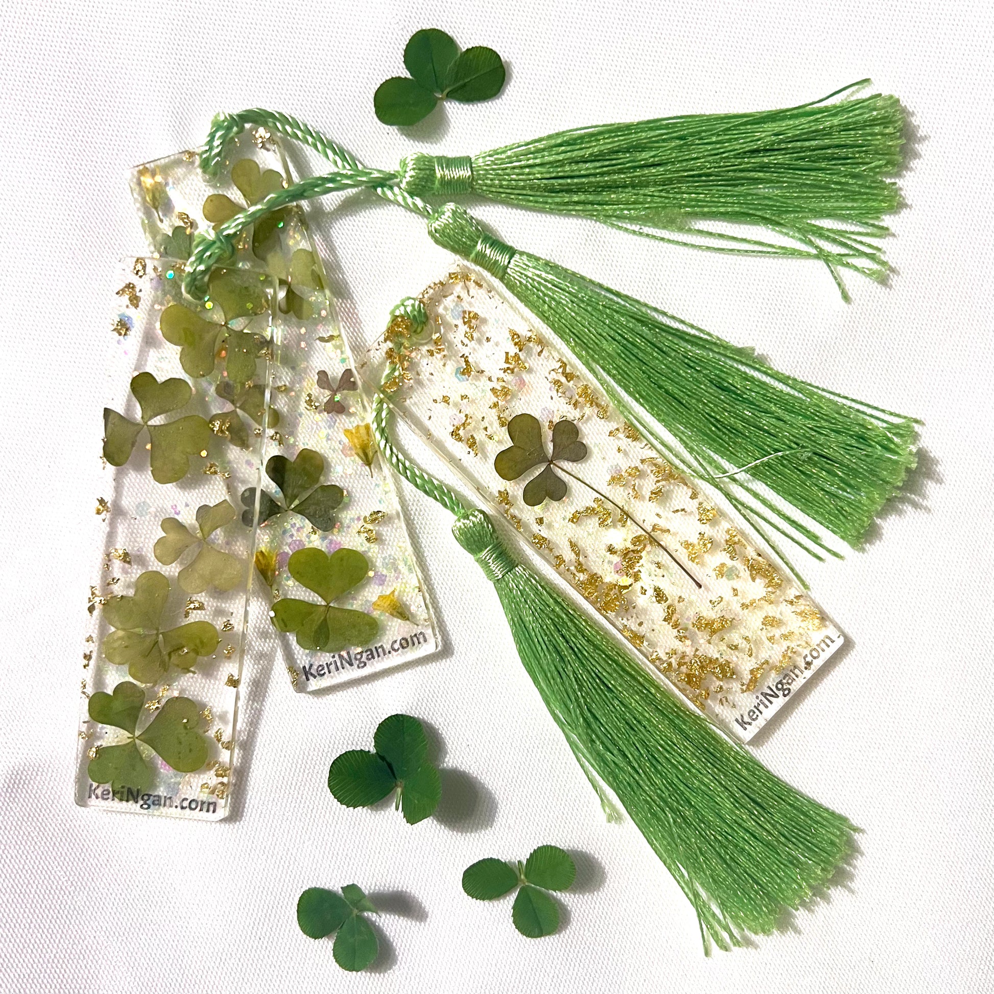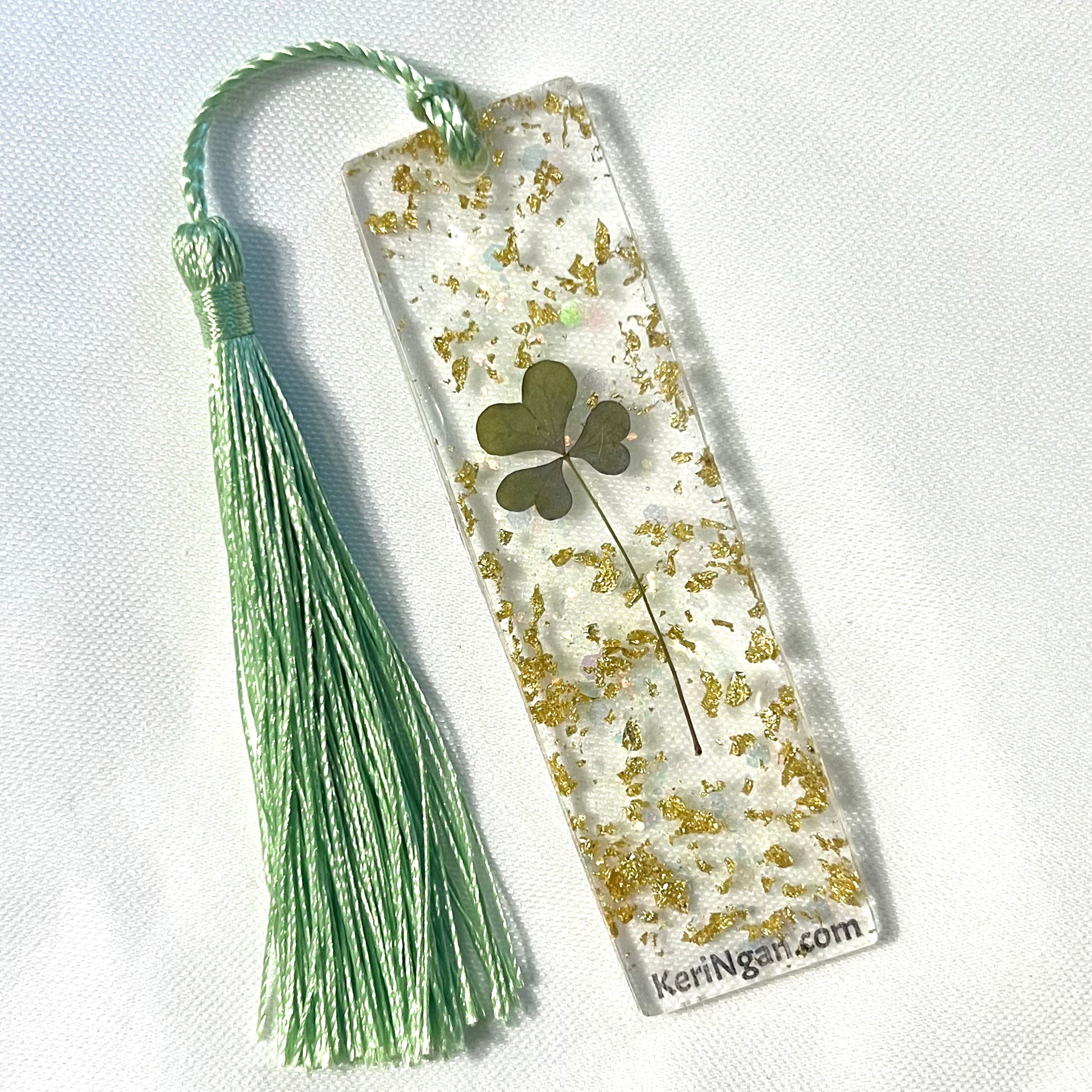 Pressed clover flowers with gold foil. Includes a tassel. Bookmarks are handmade and may vary in thickness and smoothness. Great gifts for book lovers and teachers!