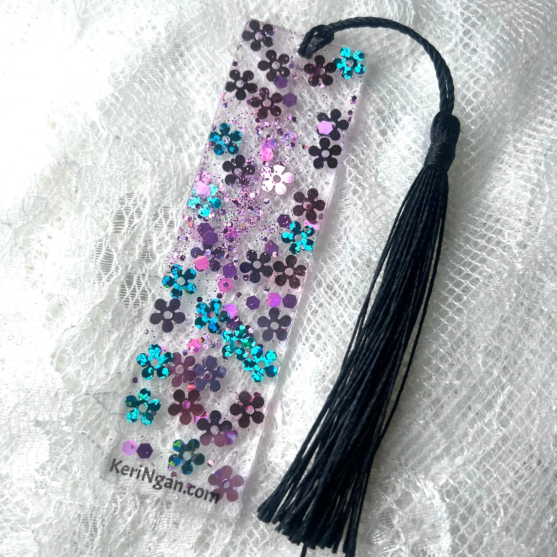 Pink, purple, and blue flower glitter muted purple holographic glitter and a black tassel.