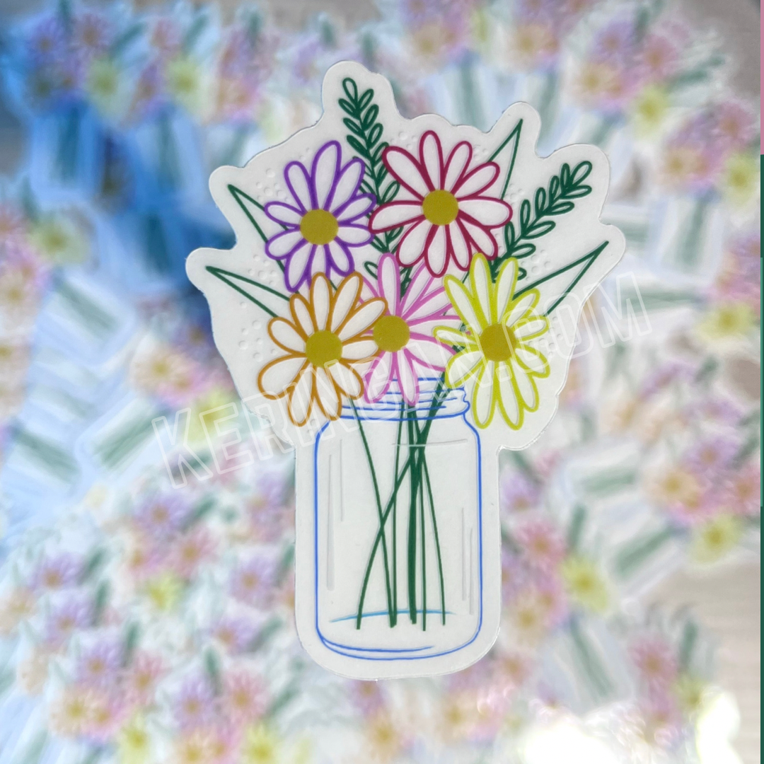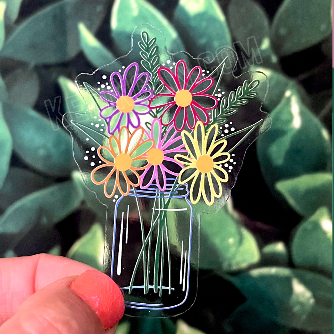 A 2.5 inch clear back sticker made with weather-proof vinyl.