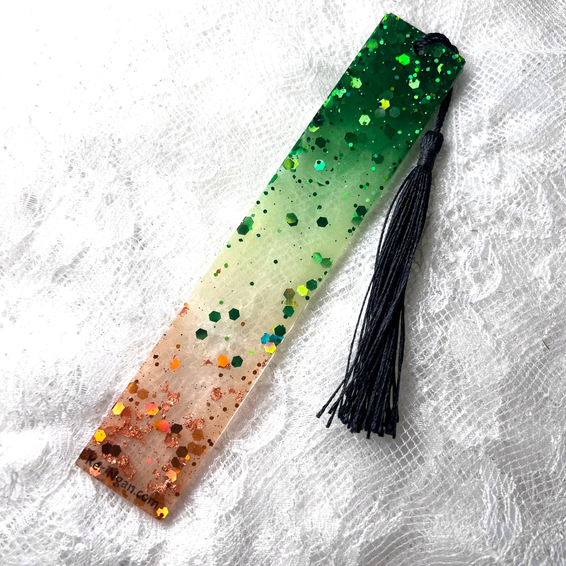 Green pigment with green holographic glitter, and burn orange holographic glitter with bronze pigment and a black tassel.