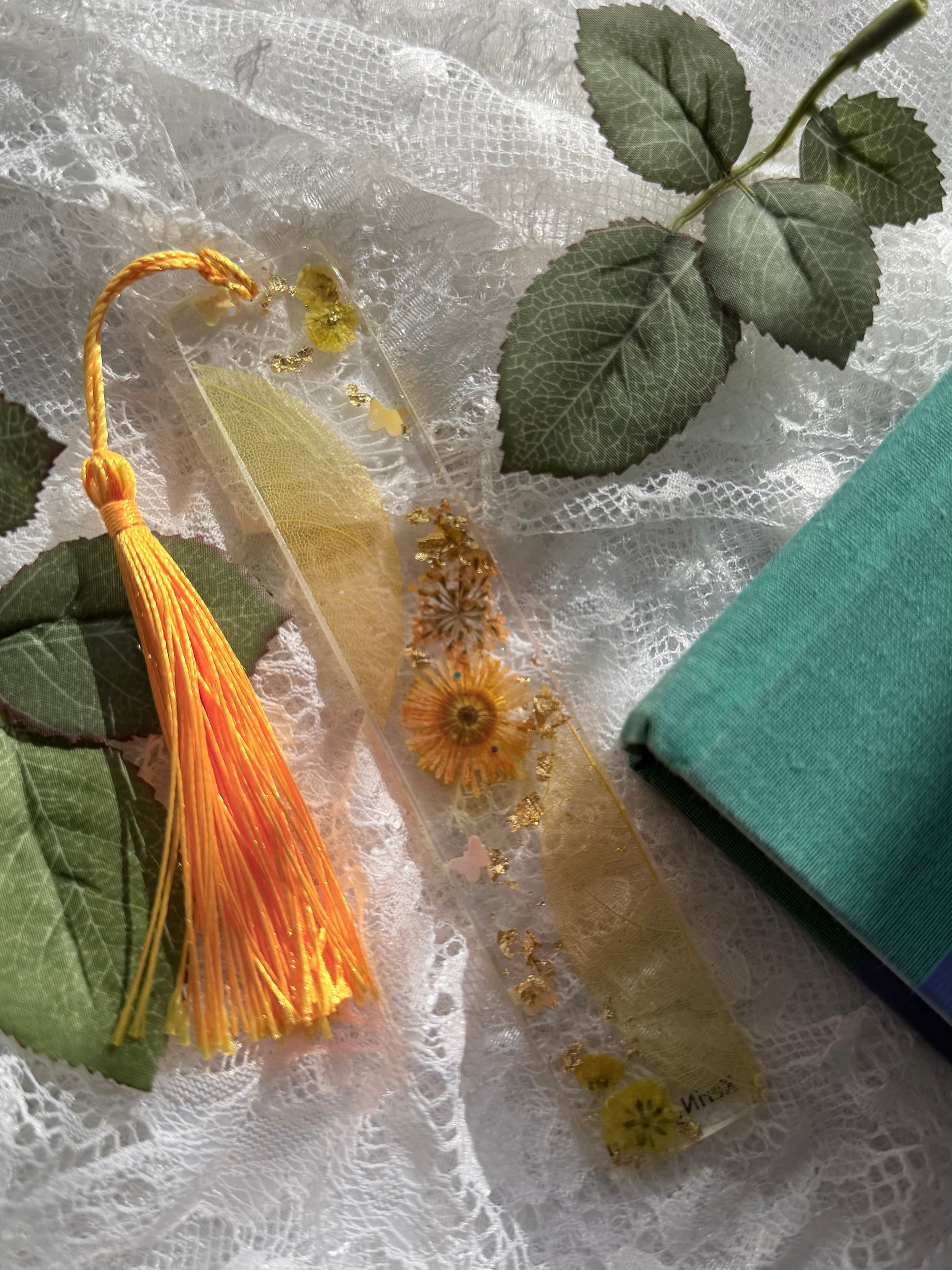 Yellow and orange pressed flowers with gold foil and butterfly confetti which includes a tassel.