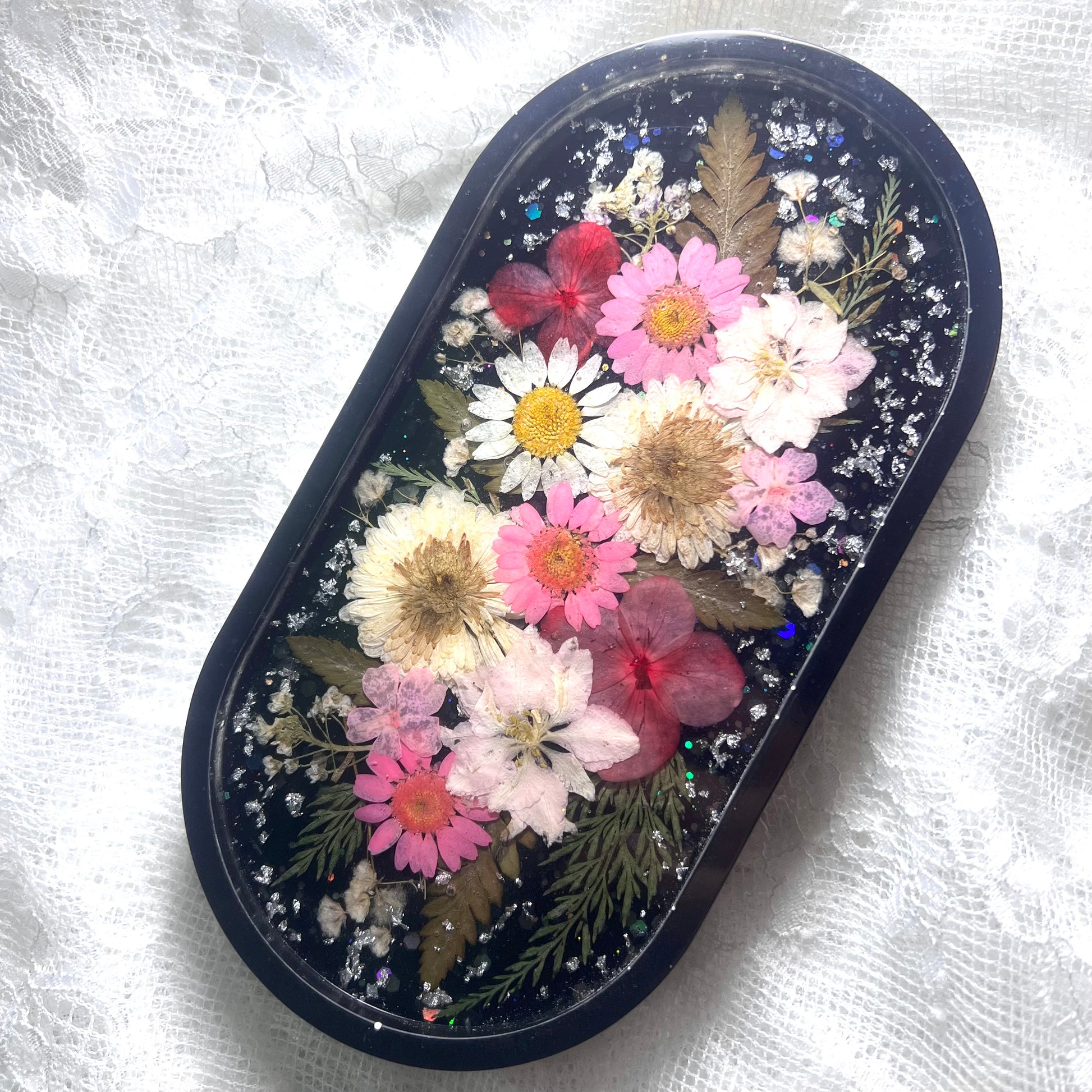 This resin tray is a one of a kind way to hold trinkets, jewelry, keys, etc. Black pigment, silver foil, silver holographic glitter, and pressed flowers. This tray contains pink, white, and red pressed flowers and a variety of foliage.