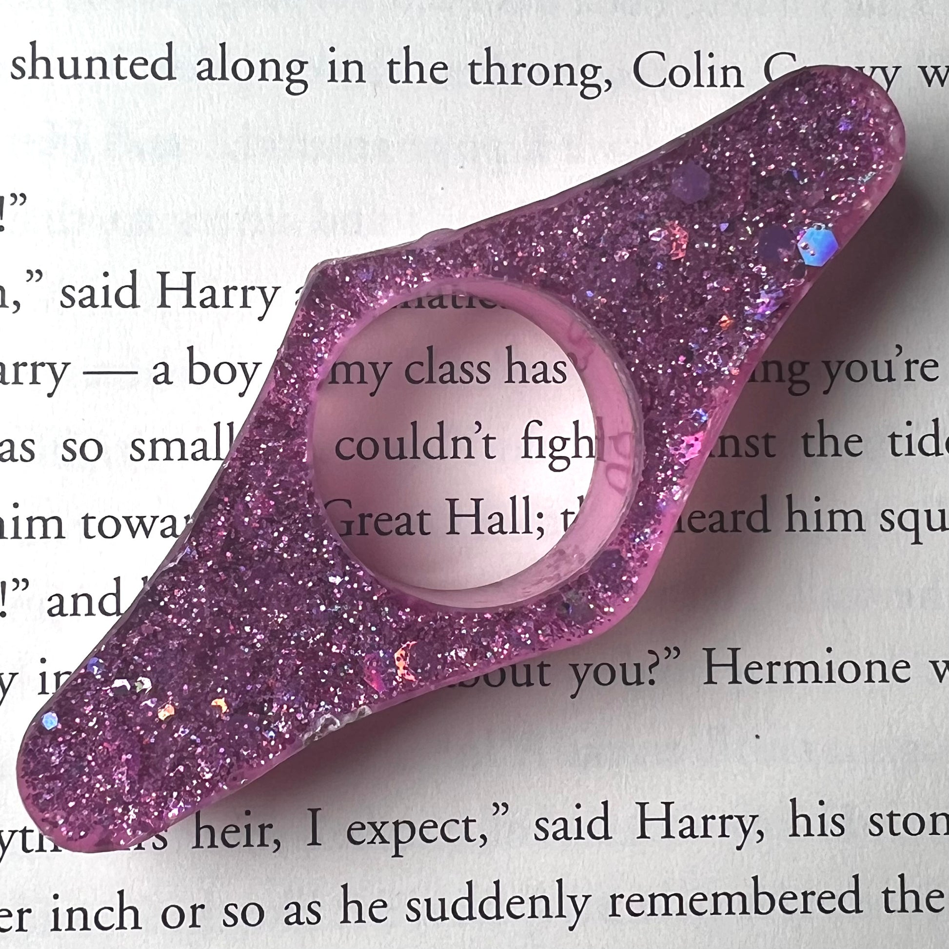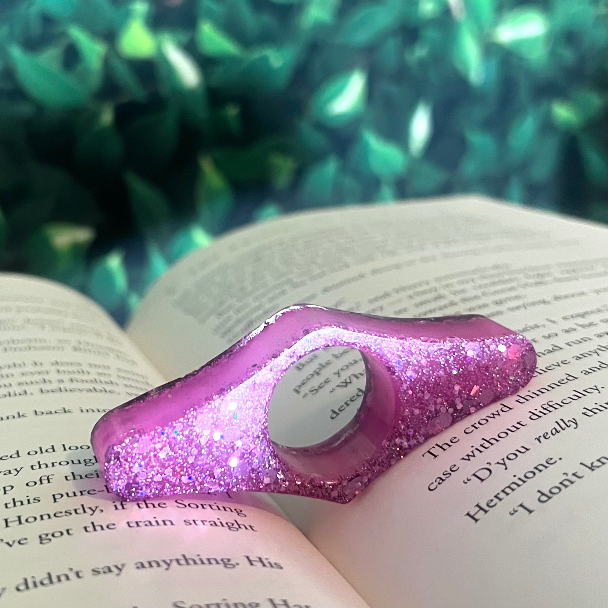 Book page holder rings help to ease discomfort in holding books one handed. Simply put your thumb through the page holder ring, place it on your open book, and make one-handed reading a breeze. Works great for both hardcover and paperback books!
