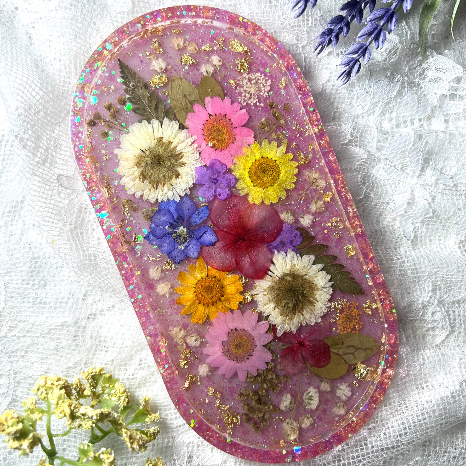 This resin tray is a one of a kind way to hold trinkets, jewelry, keys, etc. Pink pigment, gold foil, pink holographic glitter, and pressed flowers. This tray contains pink, white, yellow, orange, purple and red pressed flowers and a variety of foliage.