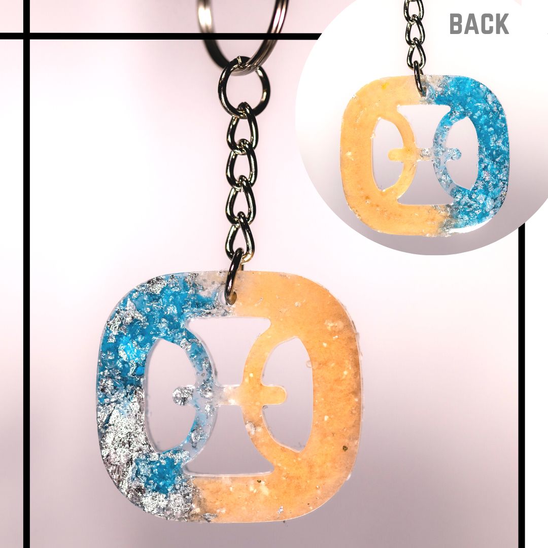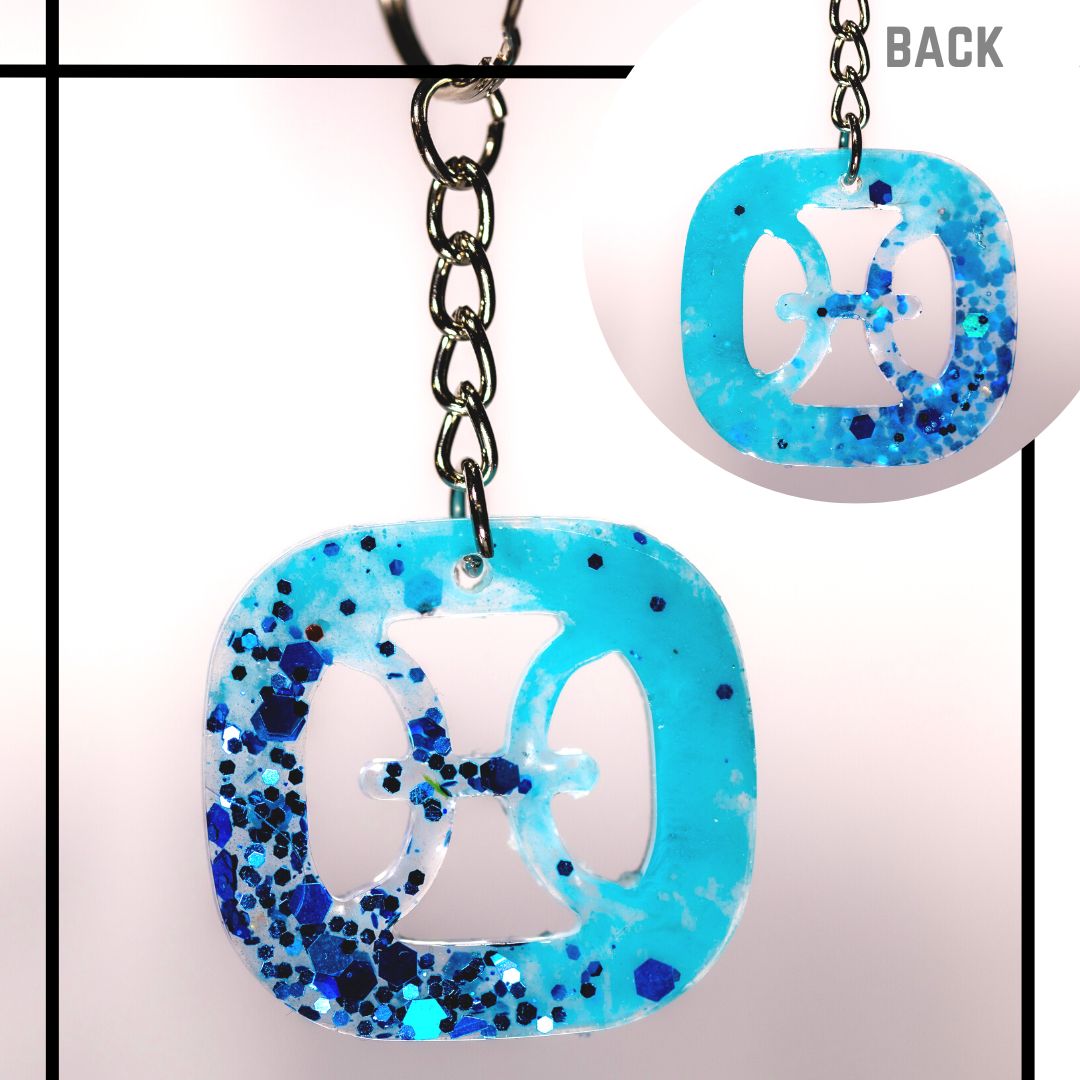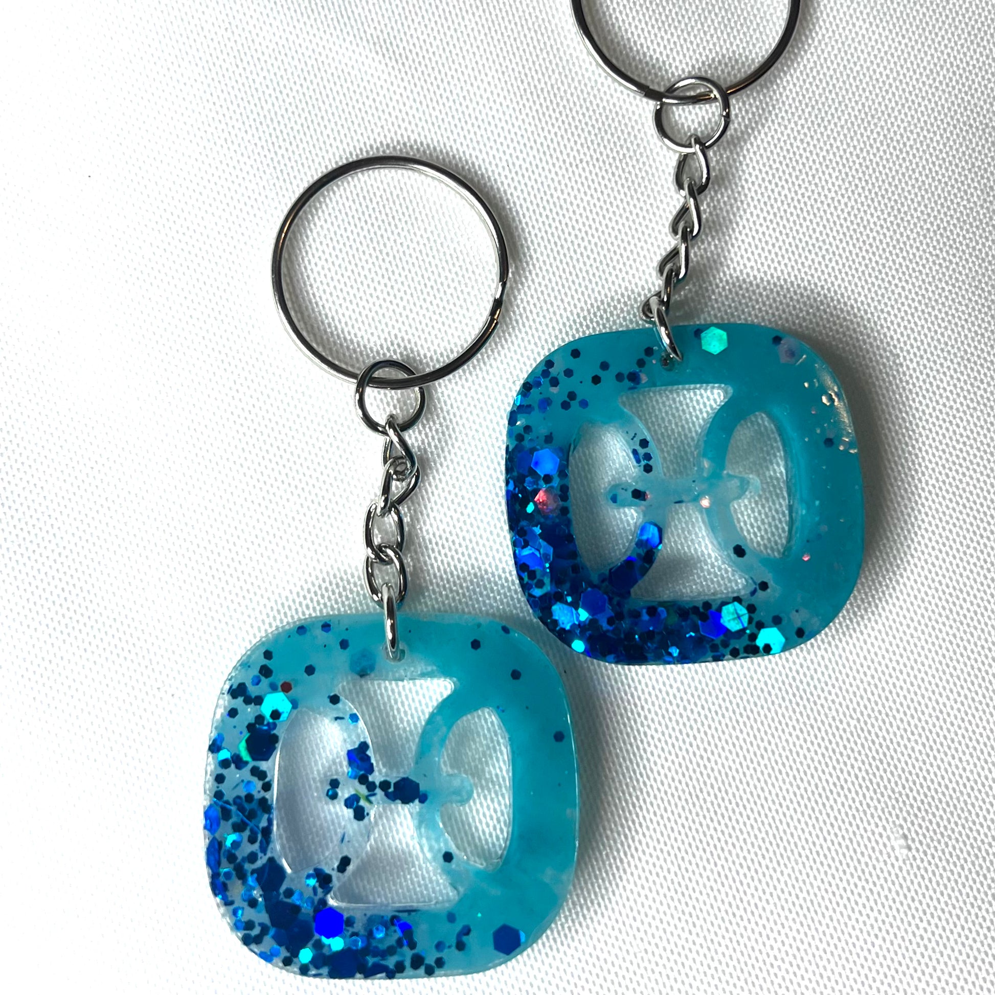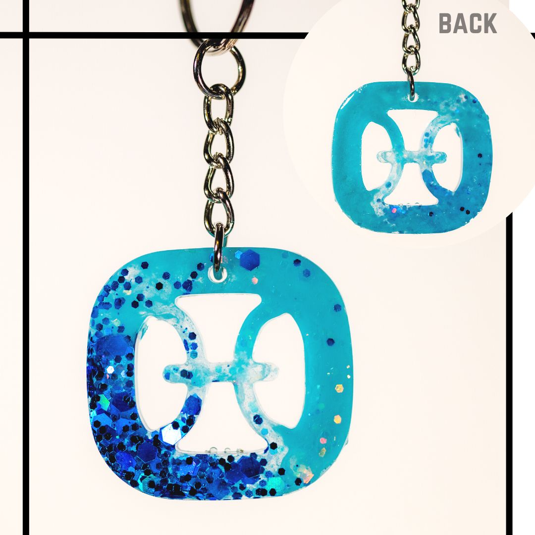 Resin keychains for Pisces friends! Each zodiac keychain charm is uniquely made, but has the water element theme in mind for the colors. Blues, whites, and silvers were used to represent the Pisces water element incased in the zodiac sign. Resin keychains include a combination of pigment, glitter, foil, or pressed flowers.