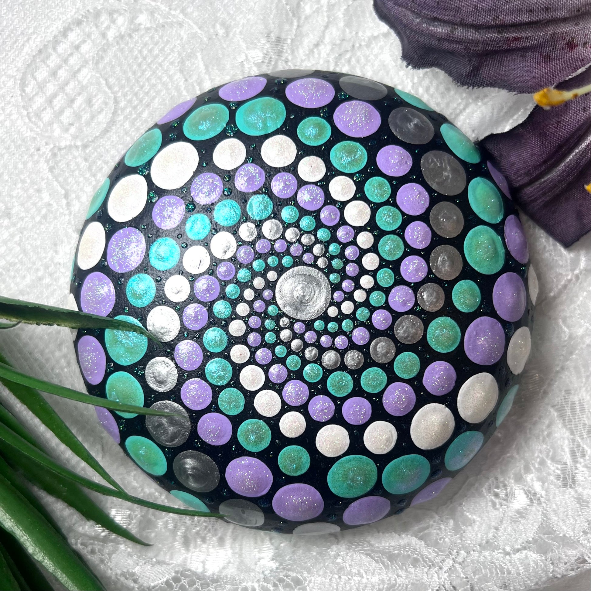 Black base with purple, white, silver, soft aqua, and holographic shimmer in a geometry swirl pattern.