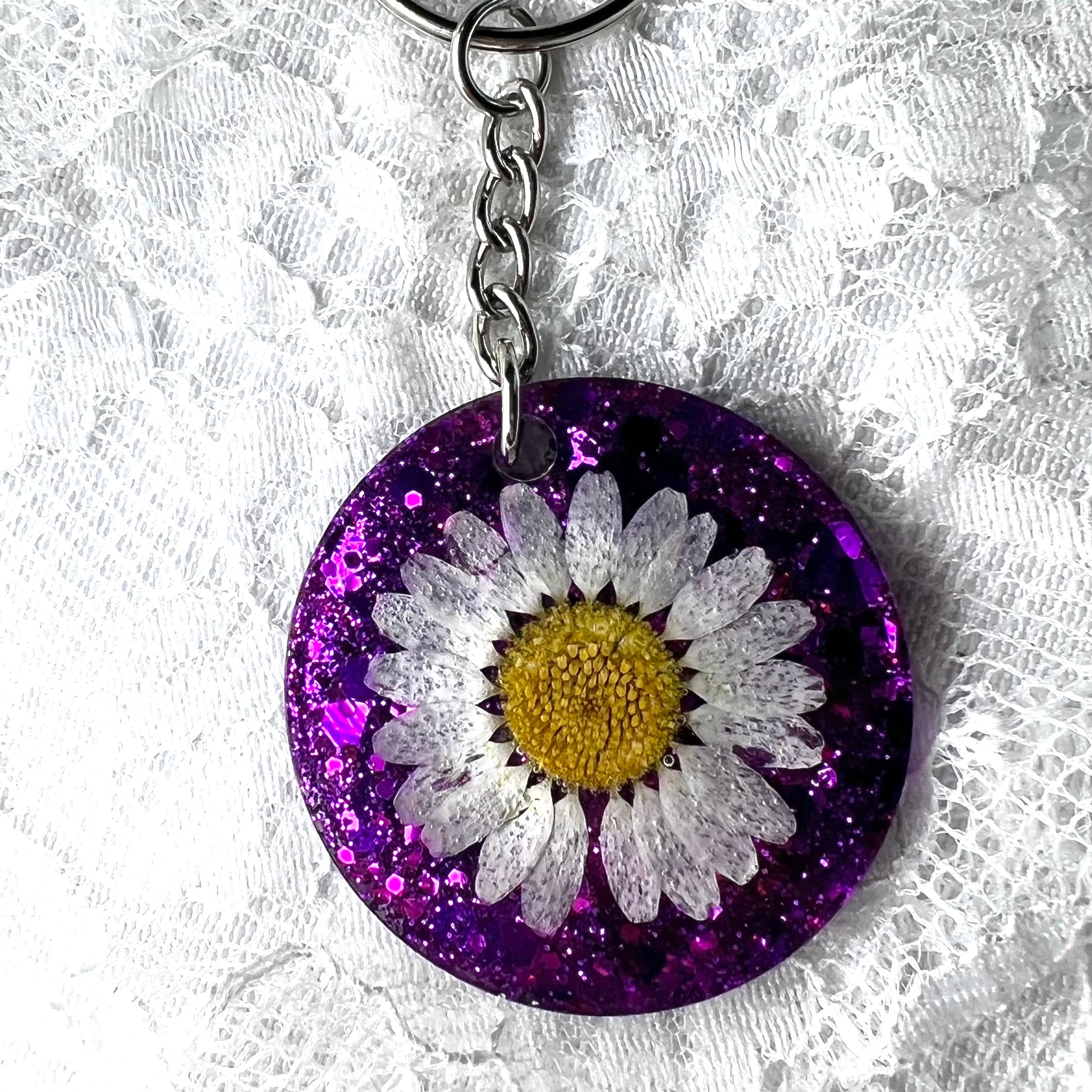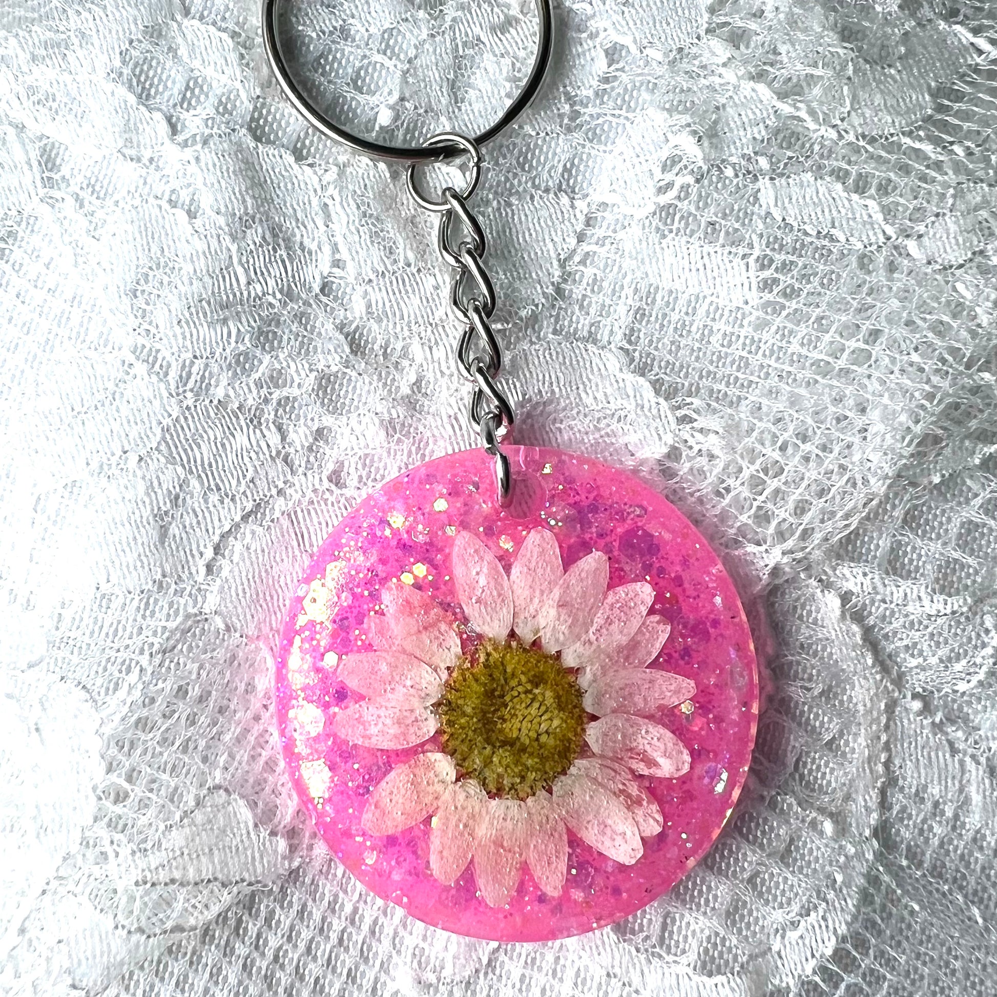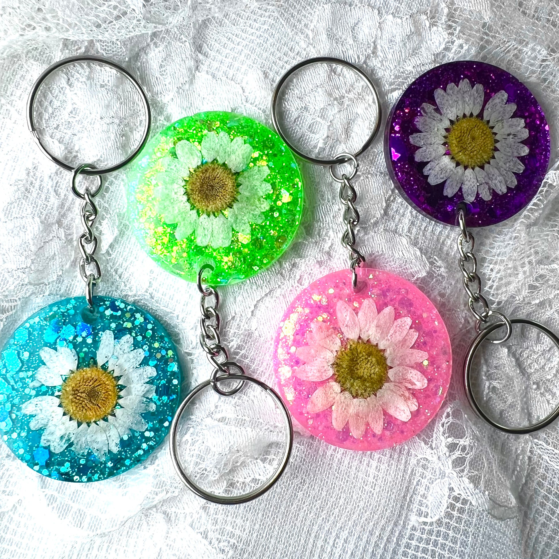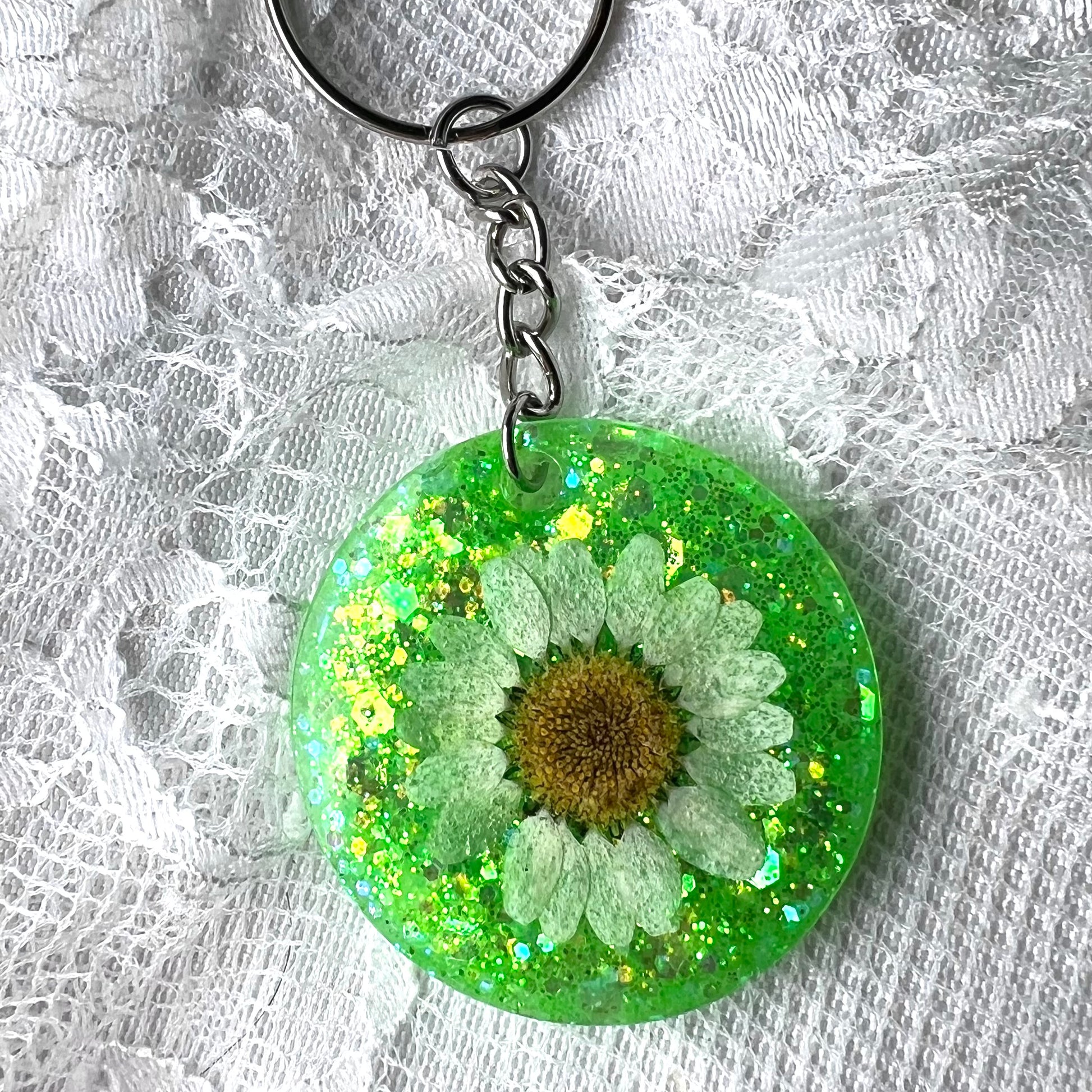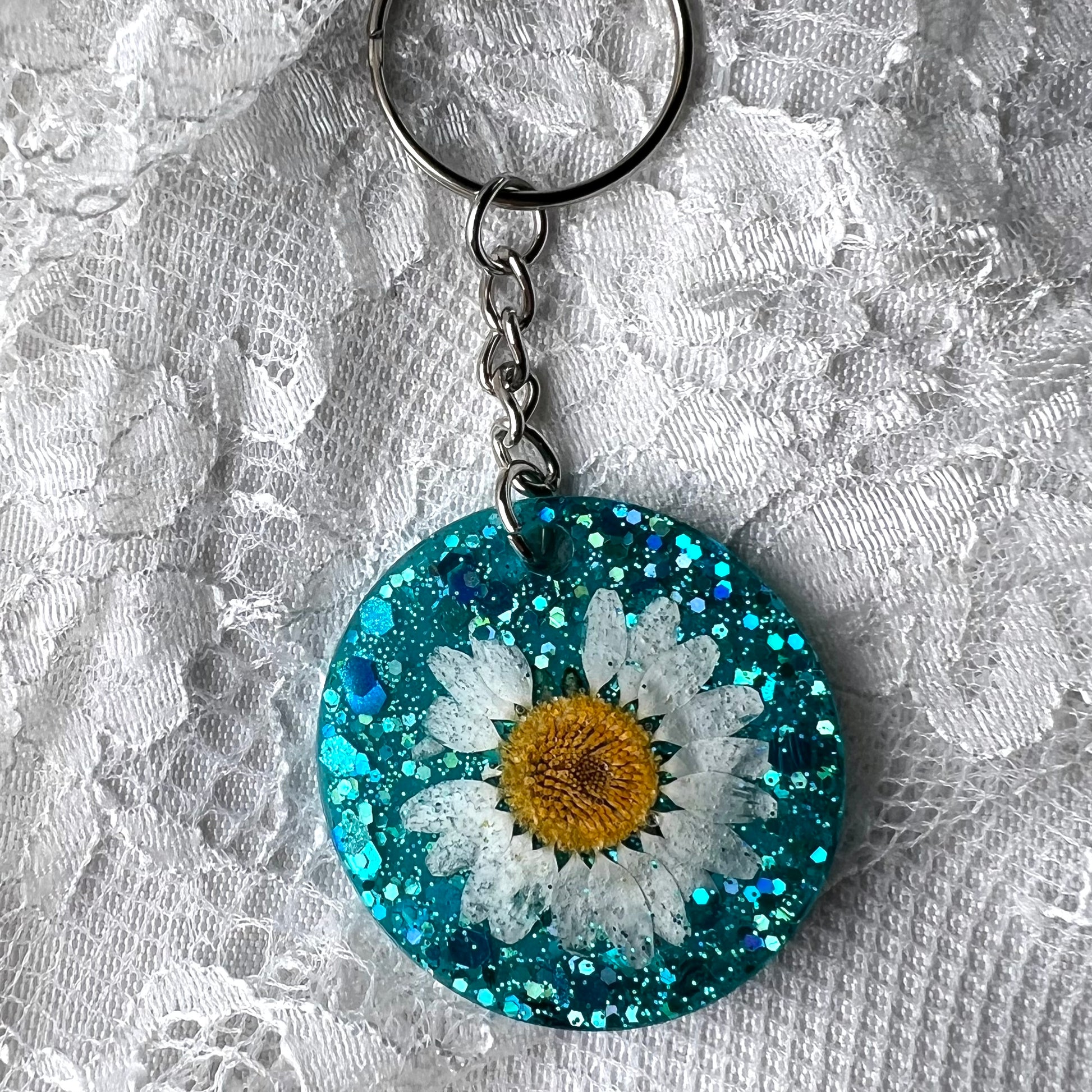 One side has turquoise pigment, the other has a delecate white pressed flower with glitter! Keychain is approximately 1.5 inches.