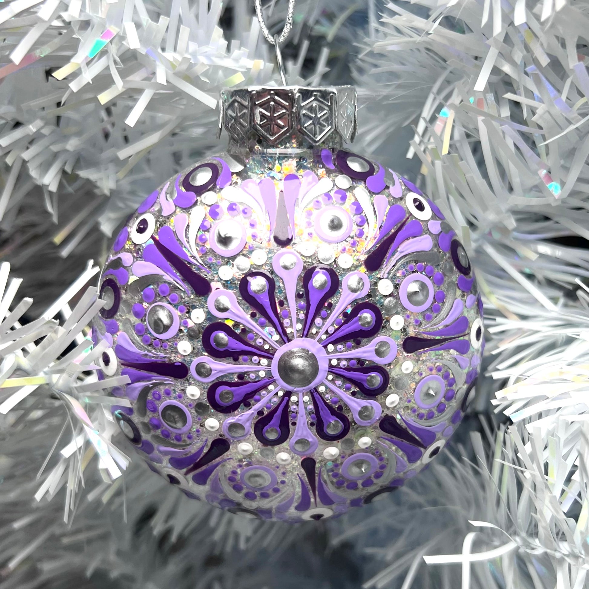 A silver/white holographic glitter ornament with silver, white, and shades of purple design.