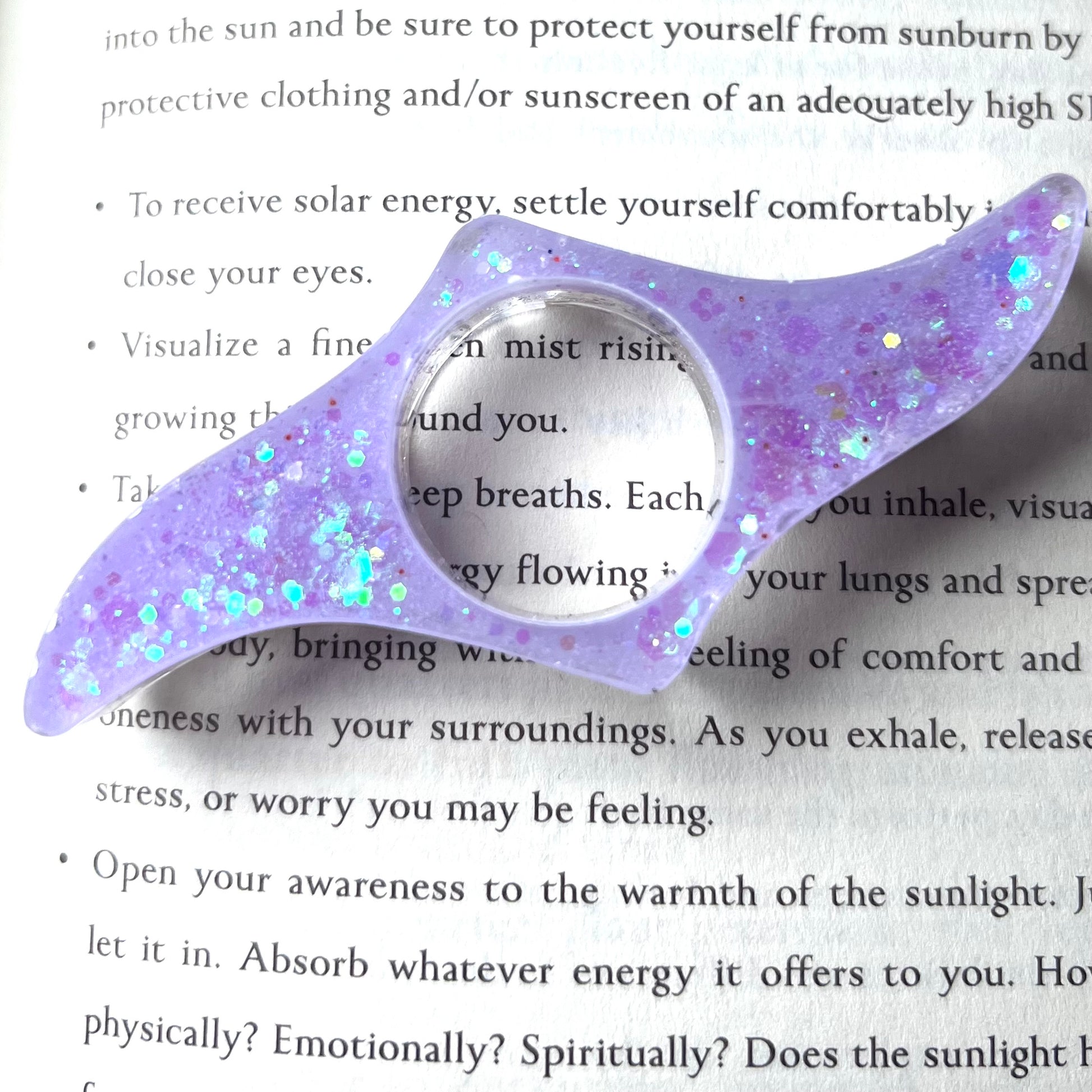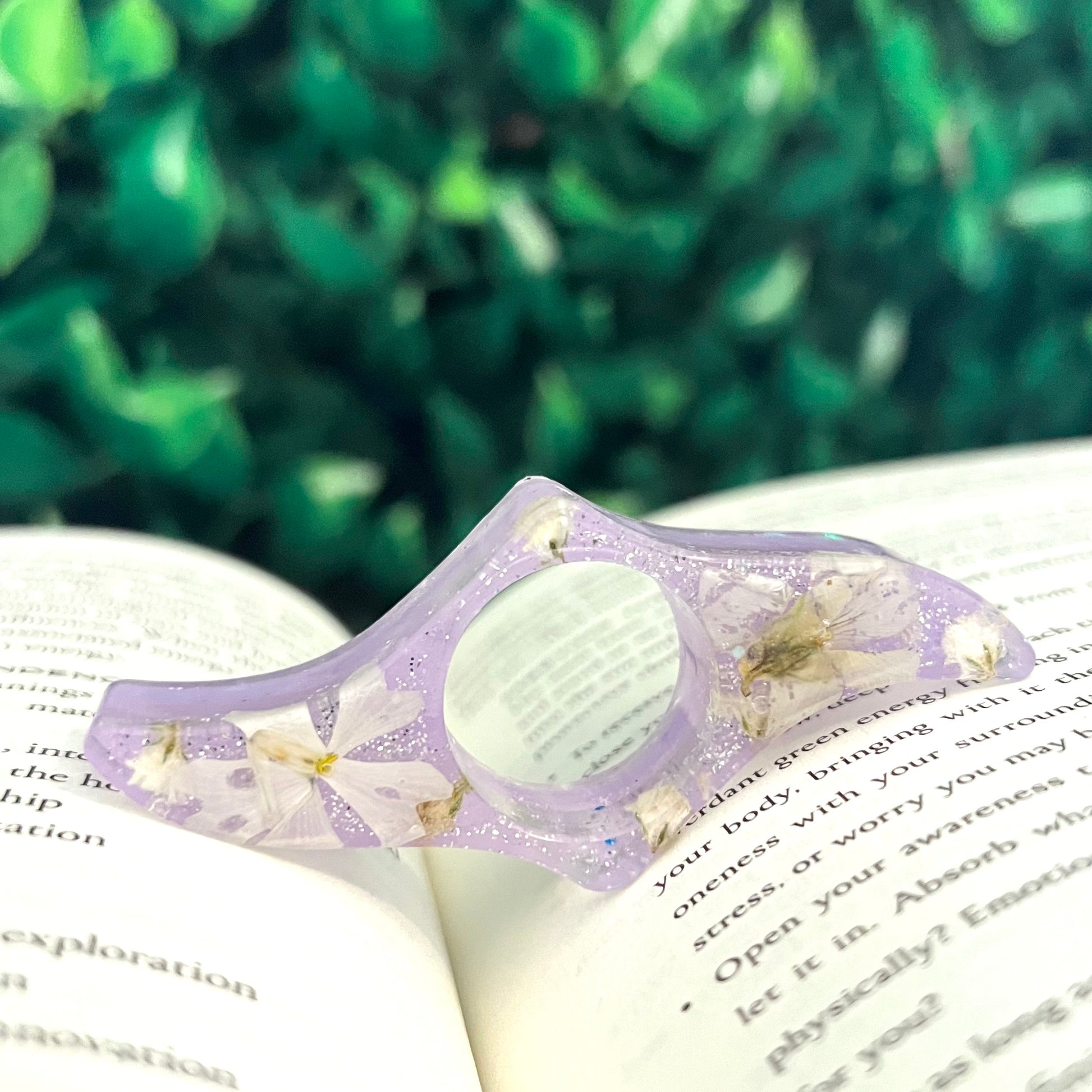 Book page holder rings help to ease discomfort in holding books one handed. Simply put your thumb through the page holder ring, place it on your open book, and make one-handed reading a breeze. Works great for both hardcover and paperback books!