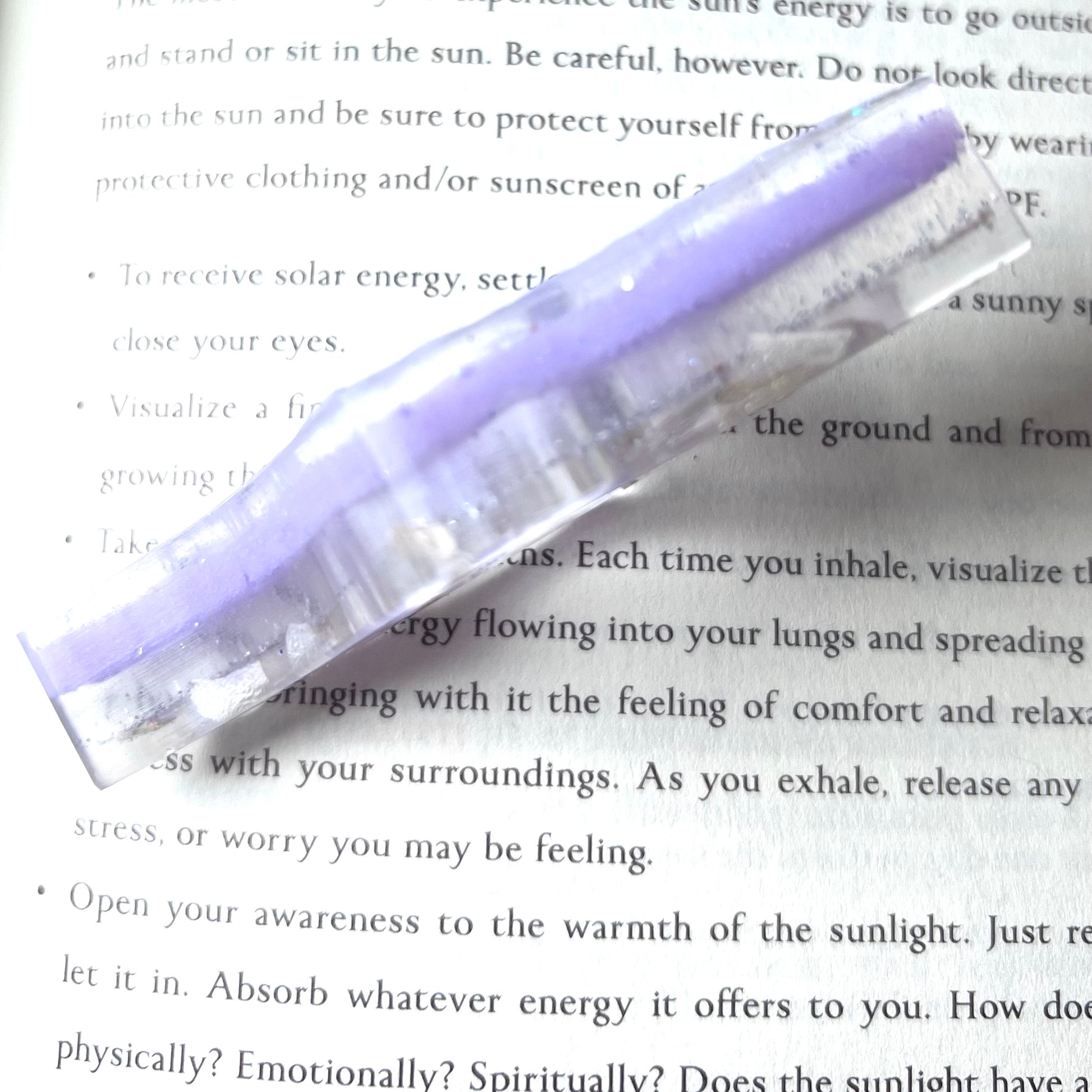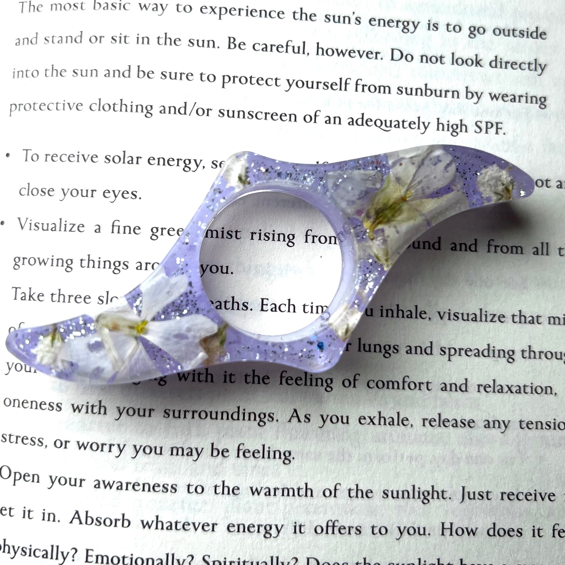 One side contains pressed phlox, fine silver glitter, and lavender pigment layers. The other side is has white holographic glitter.