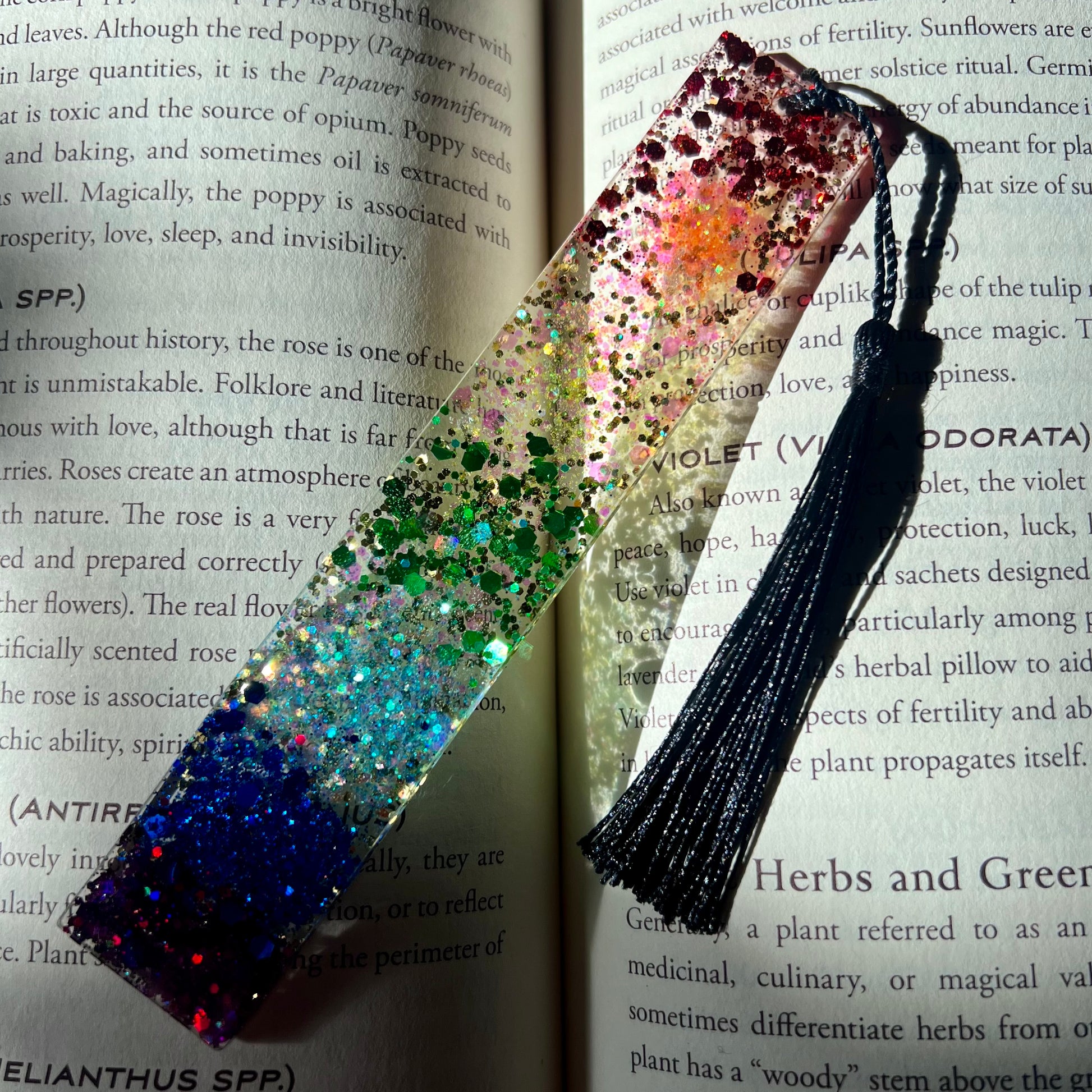 A beautiful ombre rainbow glitter and gold glitter with a black tassel. Bookmarks are handmade and may vary in thickness and smoothness. Great gifts for book lovers!