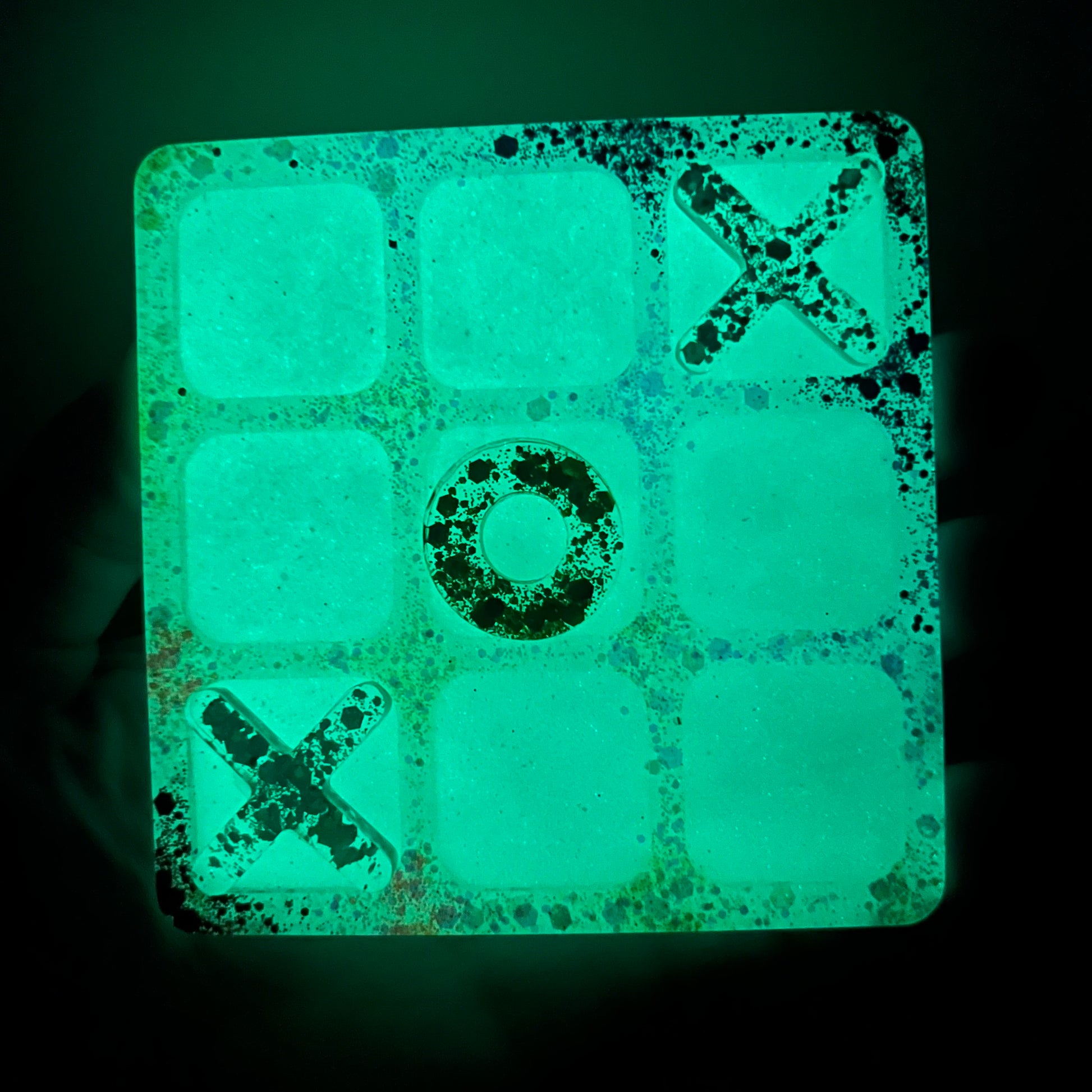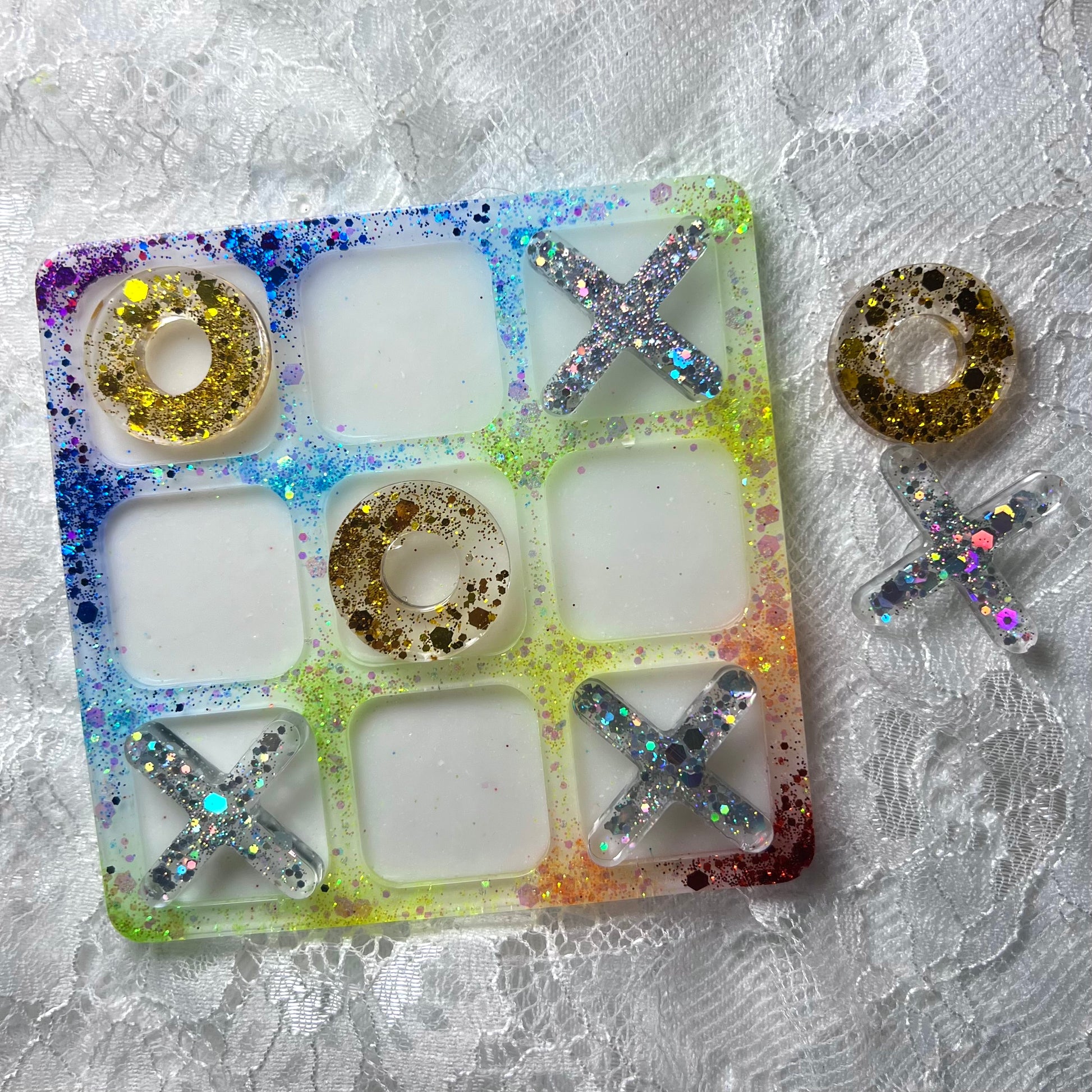 Silver glitter and Xs, Gold glitter and Os. Board has a border with glitter in rainbow order. Board squares are glow in the dark.