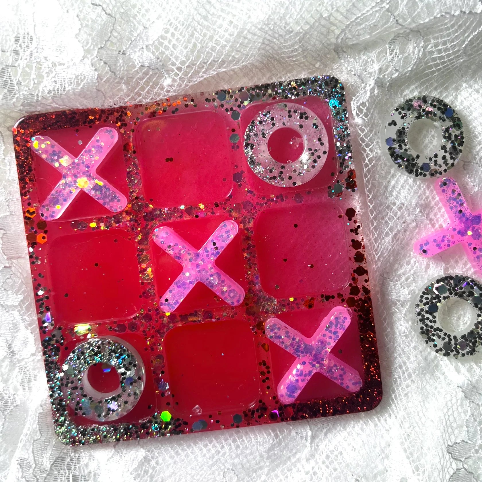 Red: Silver glitter and glow Os, Pink glitter and glow Xs. Board has a border with red and silver holographic glitter. Board squares are a red pigment ombre.