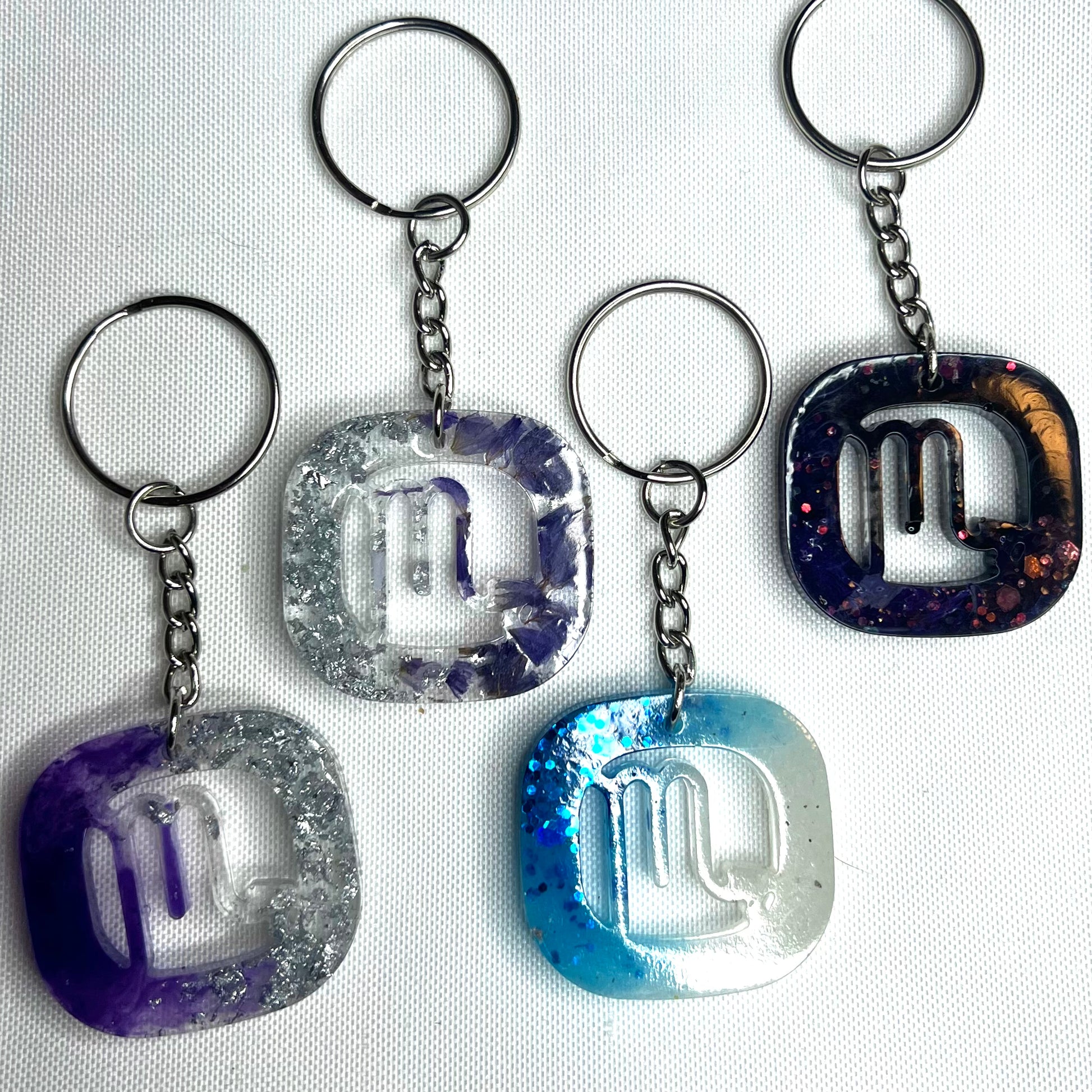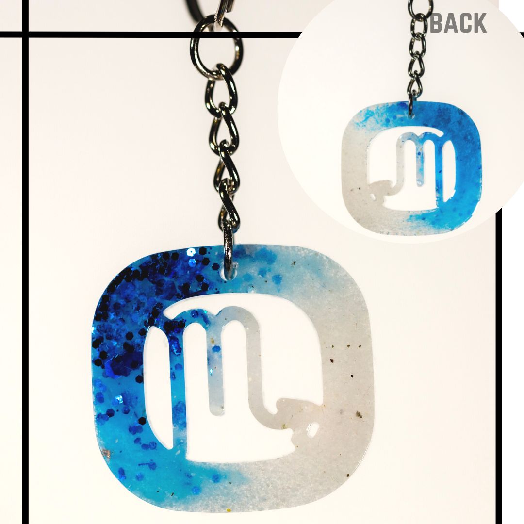 Resin keychains for Scorpio friends! Each zodiac keychain charm is uniquely made, but has the water element theme in mind for the colors. Blues, whites, and silvers were used to represent the Scorpio water element incased in the zodiac sign. Resin keychains include a combination of pigment, glitter, foil, or pressed flowers.