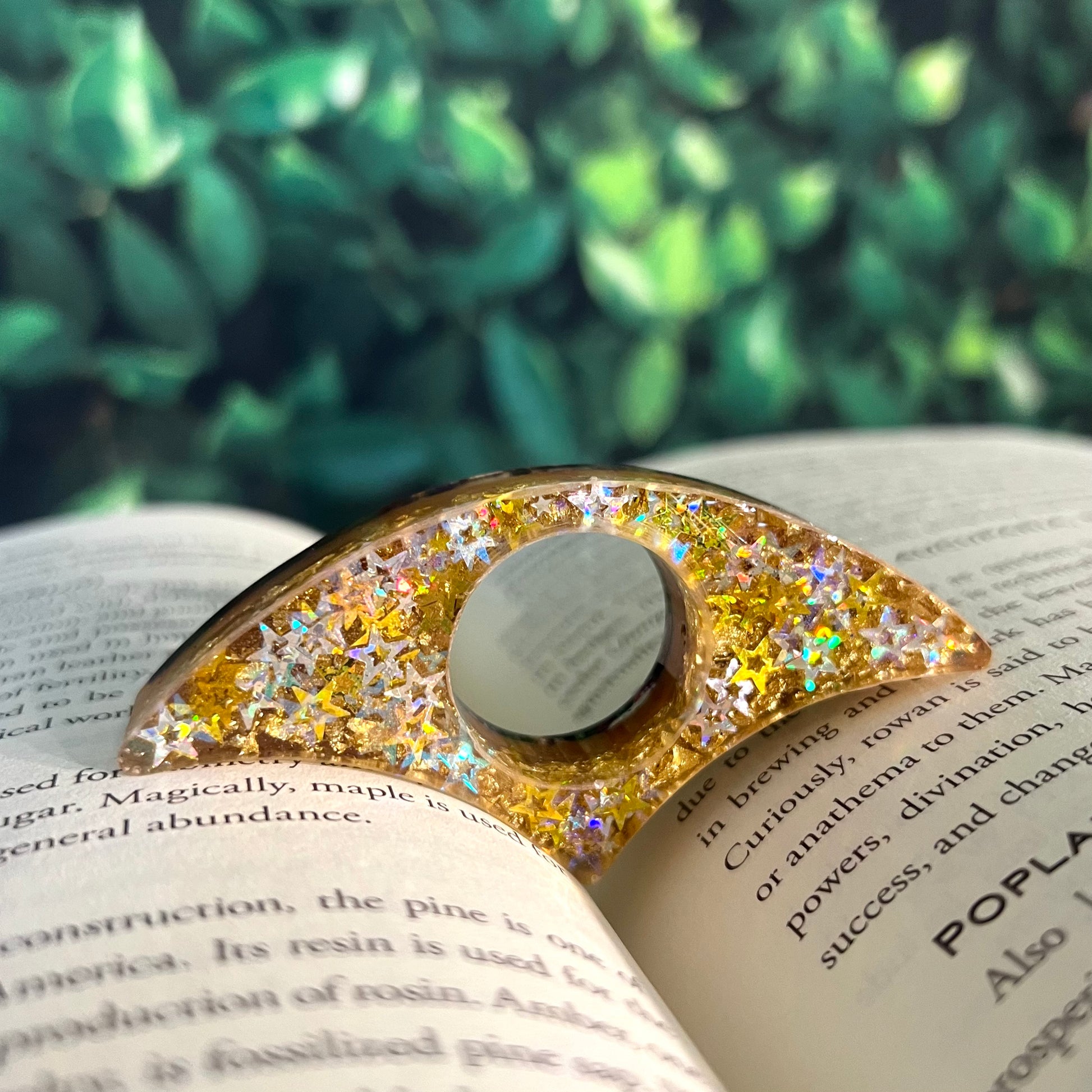 Layers of silver and gold star glitter, gold foil, bronze pigment, and holographic purple glitter.