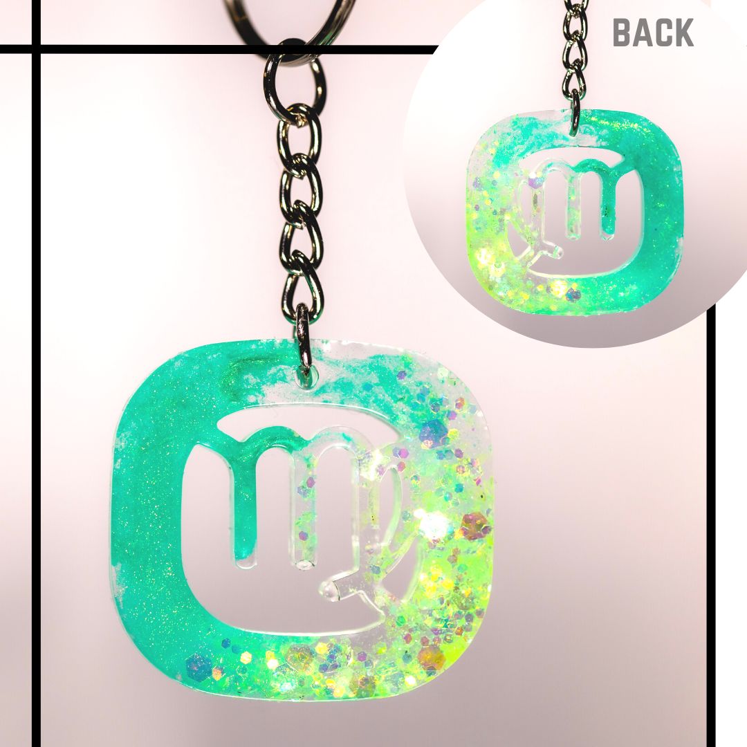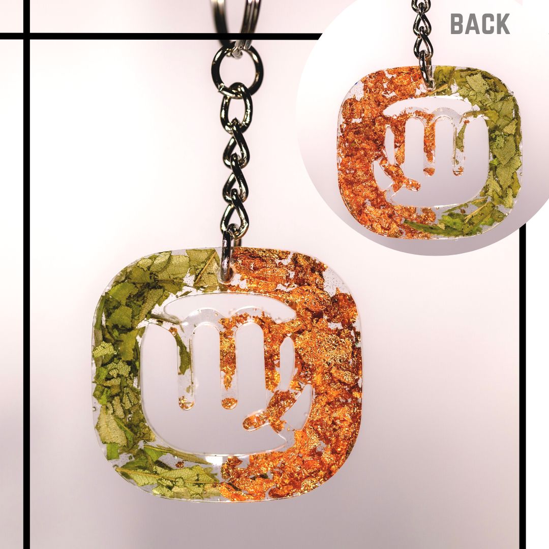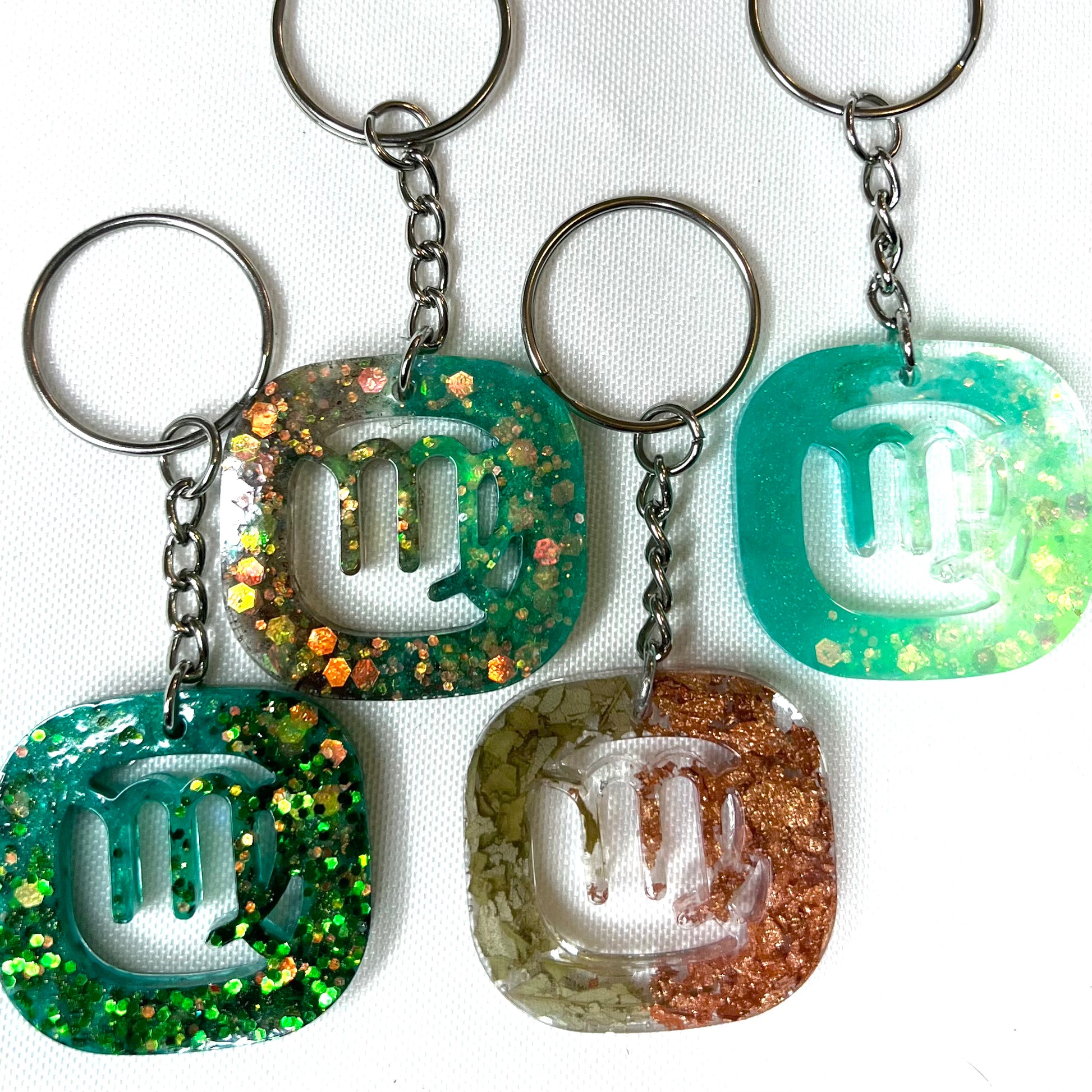 Resin keychains for Virgo friends! Each zodiac keychain charm is uniquely made, but has the earth element theme in mind for the colors. Browns, greens, and coppers were used to represent the Virgo earth element incased in the zodiac sign. Resin keychains include a combination of pigment, glitter, foil, or pressed flowers.