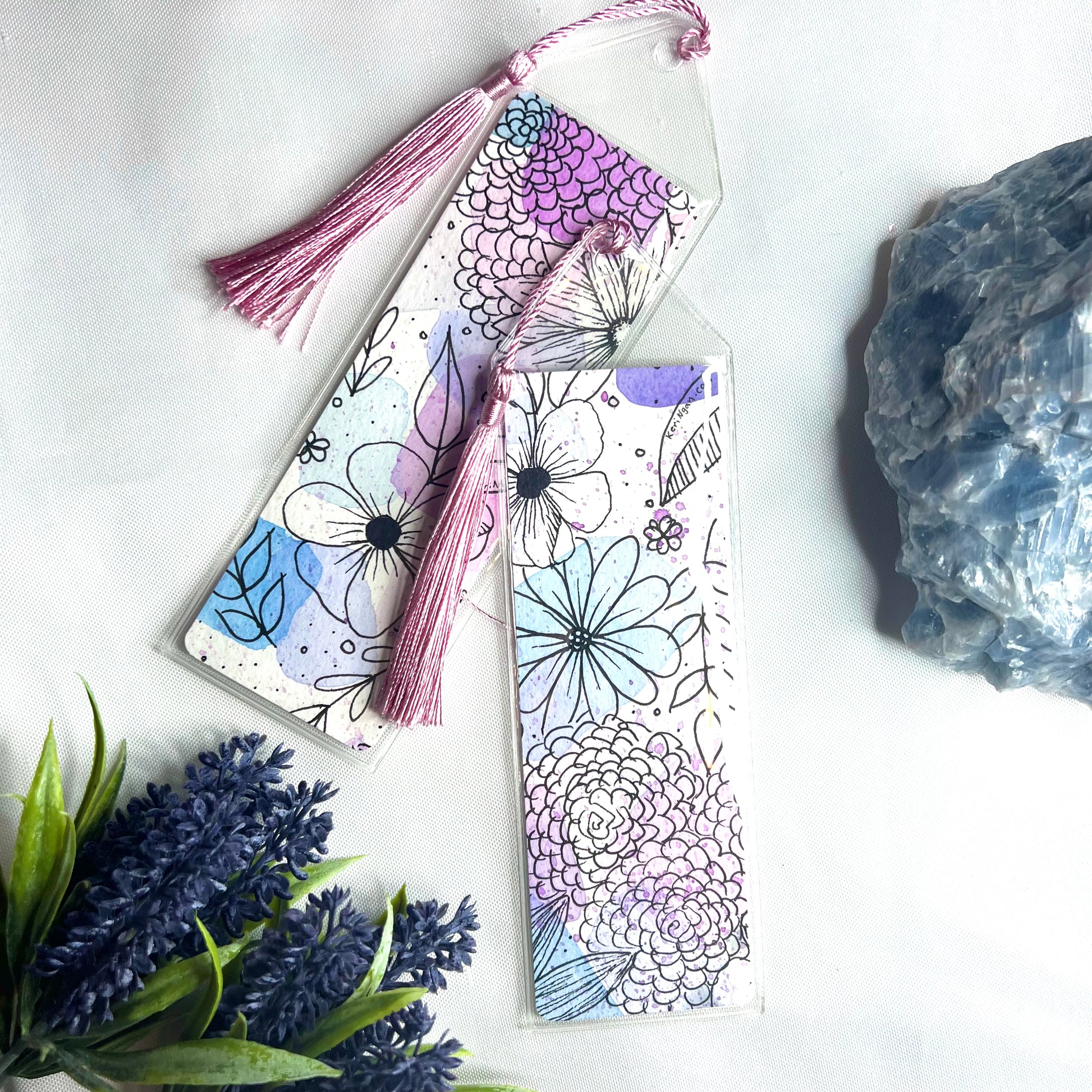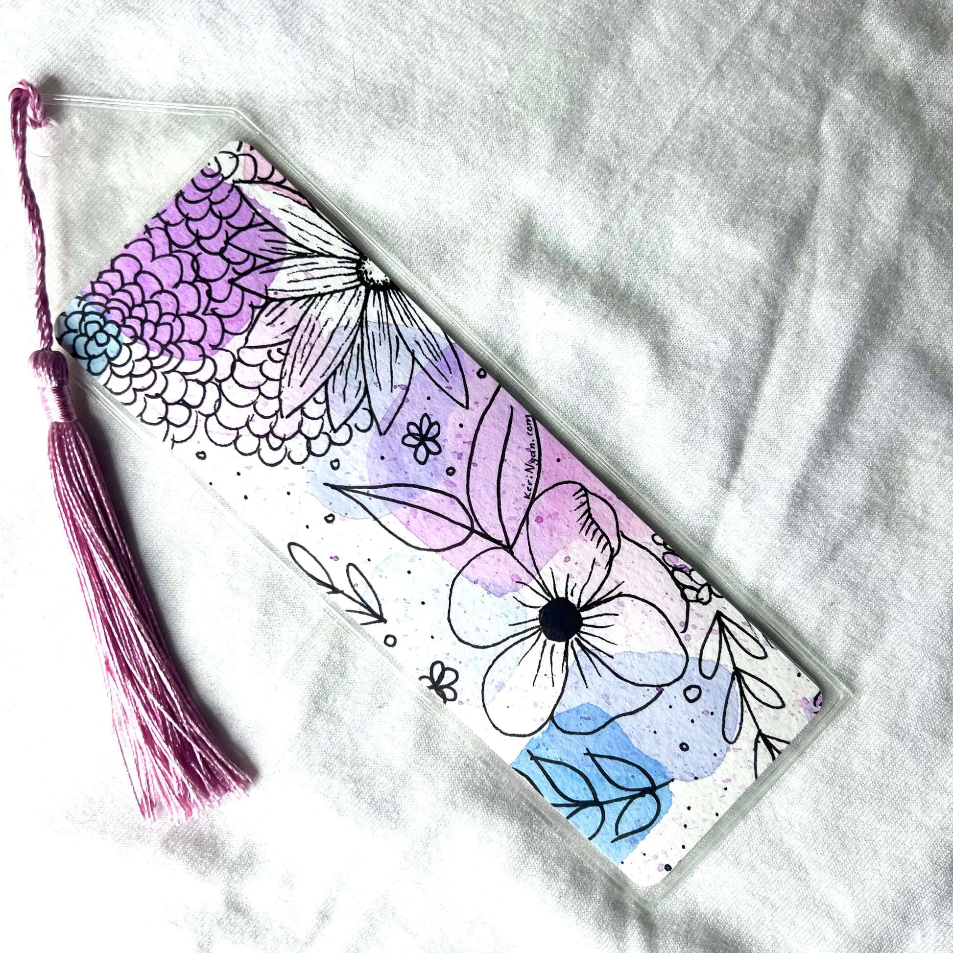 Double sided bookmark with hand painted and inked watercolor design. Plastic bookmark sleeve includes a tassel.