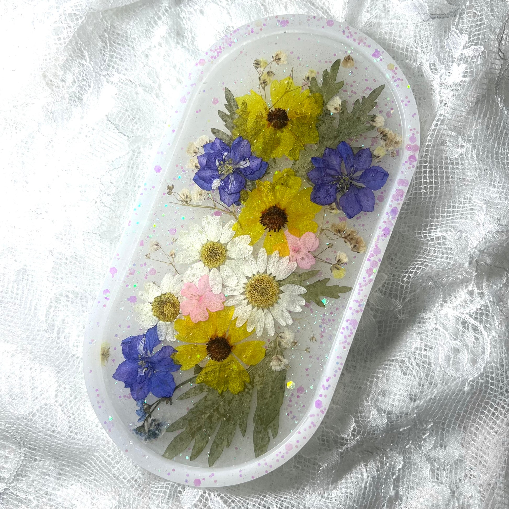This resin tray is a one of a kind way to hold trinkets, jewelry, keys, etc. Sheer white pigment, white holographic glitter, and pressed flowers. This resin tray has yellow, pink, white, and purple pressed flowers with added foliage around.